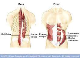 (transverse abdominus, lumbar fascia, obliques, rectus bdominus)